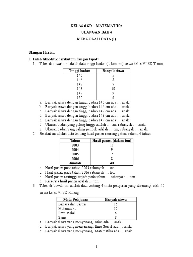 Soal Matematika Kelas 6 Sd Semester I Ulangan Bab 4 Mengolah