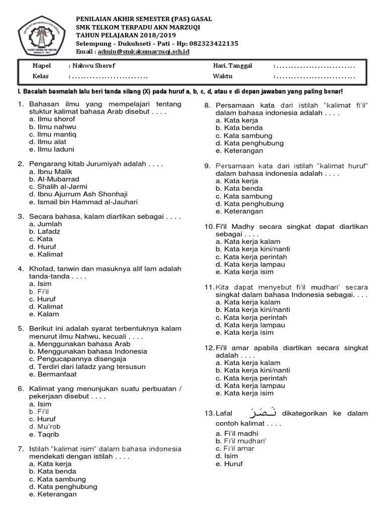 01 Nahwu Shorof Soal Uas Smt 1 X Rpl Tkj Tkr Kirim Docx