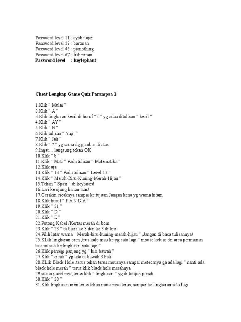 Buat sobat yang belum tahu dan ingin mencobanya sobat dapat bermain secara online di. Karna ga ngerti ngikut aja deh 3. Password quiz parampaa 1 level 11.