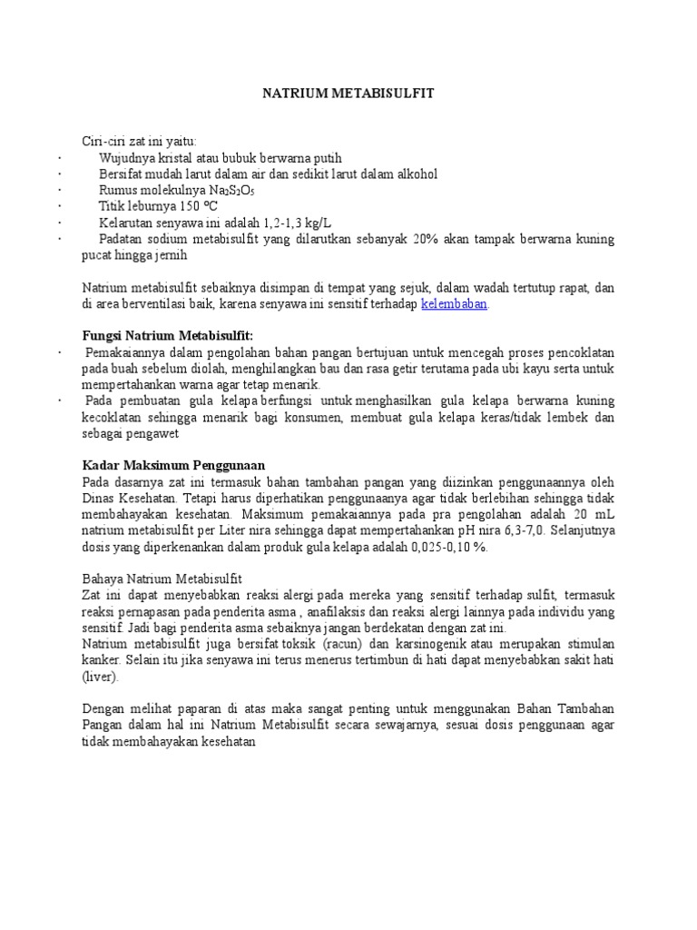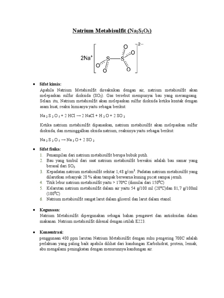 Natrium metabisulfit berfungsi untuk. Juga digunakan sebagai tambahan pada obat dan kosmetik. Dokter Anda mungkin meresepkan natrium bikarbonat untuk mengurangi kadar asam dalam darah atau urin Anda terkait dengan kondisi kesehatan tertentu. Bahan tersebut antara lain 1.