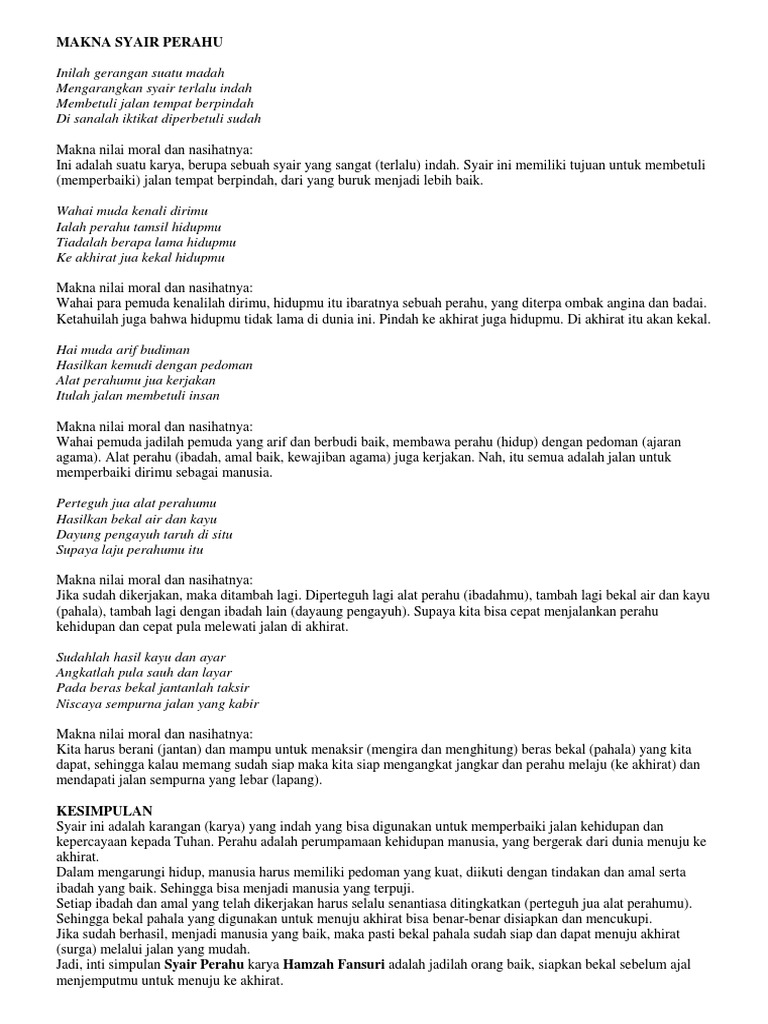 Makna dan isi syair perahu karangan hamzah fansuri. Syair adalah salah satu karya sastra yang berkembang di Aceh pada masa akhir abad ke-18 sampai awal abad ke-19. Baca Lengkap 40 Bait Syair Perahu.